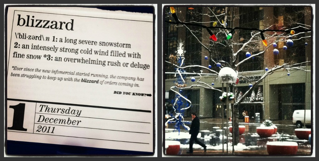 In other news, Colorado welcomed December today with a good dose of the cold, wet, frozen water from above. It seems my coworker’s daily word desk calendar was in on this plan as showcased in that photo up there. What are the odds? If I was a mathematician, I’d be clever and tell you exactly what the odds are, but alas, I am not.